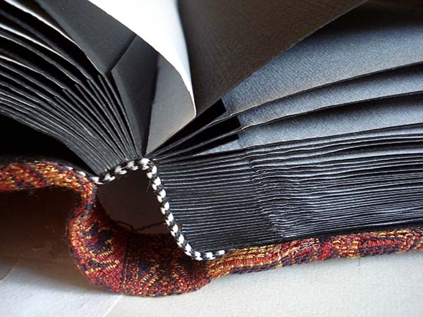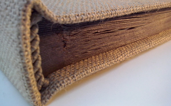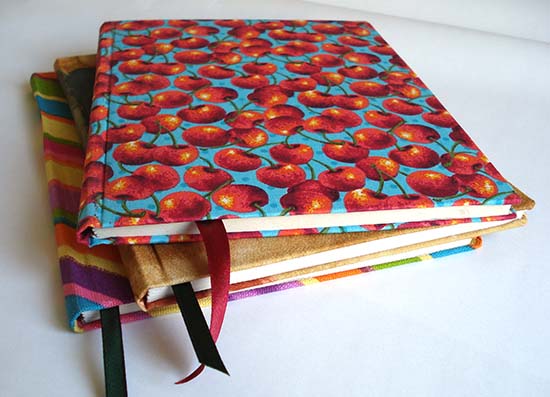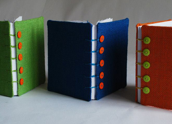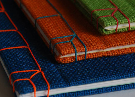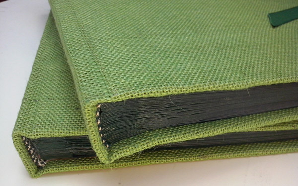 Cosidos completamente a mano en cuadernillos con hojas de papel reciclado.Tapas forradas en tela: brocato, algodón, crea cruda.